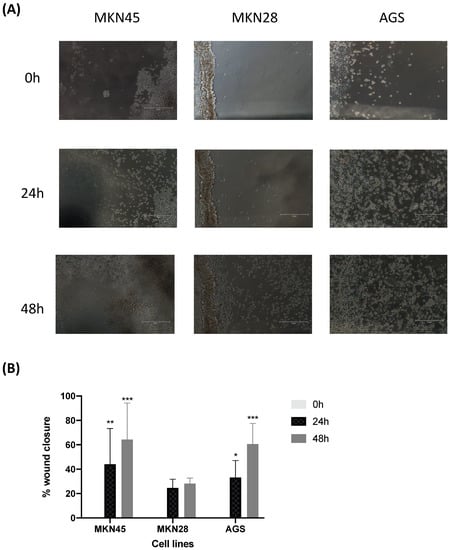 To determine the invasive and migratory capacity of the cancer cells, cell mobility was assessed by an in vitro wound healing assay. MKN28 and MKN45 cells (5 × 104 cells/well) and AGS cells (1 × 104 cells/well) were seeded onto 24-well plates, in triplicate for each cell line, to grow to full confluence in a monolayer for 72 h. Then, on the day before the scratch, the medium was changed to RPMI without FBS. A sterile 20–200 μL pipette tip was held vertically to make a scratch along the central area in each well. The detached cells and debris were removed by washing with 500 μL of PBS twice. Afterward, 500 μL of fresh medium was added and the plates incubated for 48 h to enable cells to migrate and invade the cell-free scratch. The scratch closure was monitored, and the progression registered at 0 h, 24 h, and 48 h at a magnification of 300×. Wound area closure was automatically quantified using ImageJ© software v.1.53t (NIH, Bethesda, MD, USA), measuring the gap size and tracking the gap width by drawing lines along the leading edges of each cell front. The results are presented as percentage of wound closure.