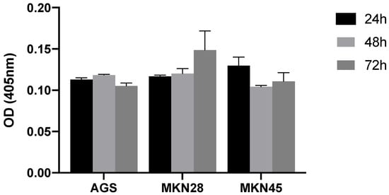 Results of MKN28, AGS, and MKN45 cell line senescence in β-galactosidase assay at different time points (24 h, 48 h, and 72 h). No significant association was found. OD, optical density.