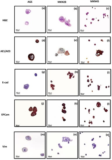 Regarding H&E, all the cell lines were constituted of round to oval cells with marked pleomorphism (cells with different sizes). The AGS neoplastic cells commonly exhibited cytoplasm vacuoles. The MKN45 neoplastic cells presented a predominant plasmacytoid morphology. The immunocytochemistry revealed cytoplasm immunoexpression of the epithelial markers AE1/AE3 and EpCam in all cell lines evaluated. However, the privation of E-cadherin expression was observed in the AGS cell line (Figure 6g). All cell lines did not express vimentin.