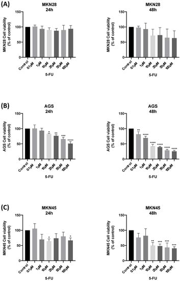 Viability of GC cells incubated with 5-FU. Cultured cells were seeded in 96-well plates and treated with 5-FU (0.1–100 μM) for 24 and 48 h. (A) The effect of 5-FU on MKN28 cell viability at 24 h and 48 h. (B) The effect of 5-FU on AGS cell viability at 24 h and 48 h. (C) The effect of 5-FU on MKN45 cell viability at 24 h and 48 h. Values are expressed as percentages of control and represent means ± SEM. Each experiment was done three times independently (n = 3); * statistically significant vs. control at p < 0.05. ** Statistically significant vs. control at p < 0.01. *** Statistically significant vs. control at p < 0.001. **** Statistically significant vs. control at p < 0.0001.