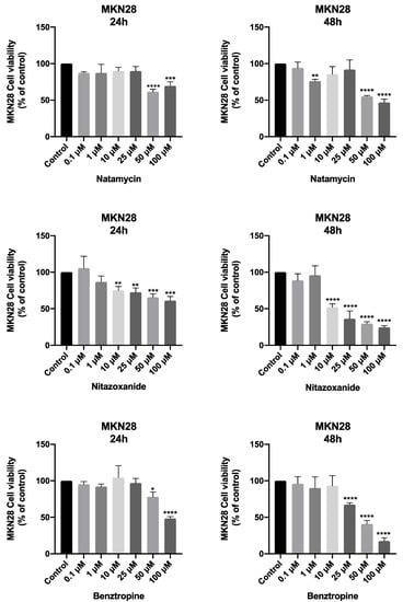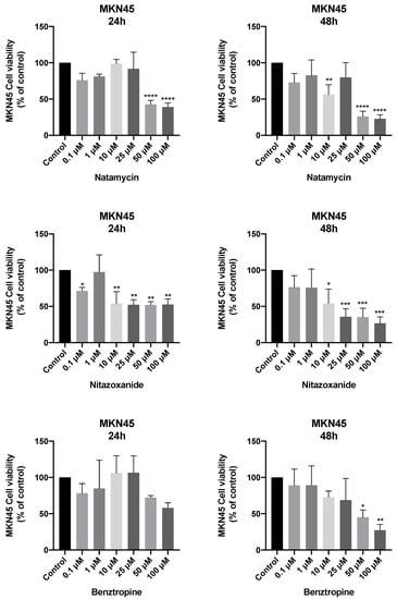 The potential antitumor effects of different repurposed drugs as single agents, namely, NAT, NTZ, and BZT in MKN28, AGS, and MKN45 GC cells were evaluated. The three cell lines were treated with increasing concentrations of each drug, from 1 to 100 μM, to investigate the viability of the cells 24 and 48 h after treatment.