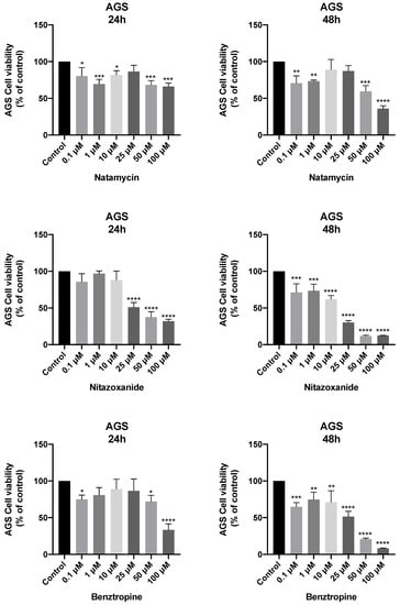 Based on these results, NTZ and BZT displayed significant effects in AGS cells. Treatment with BZT at doses above 0.1 μM for 48 h had a strong effect on cell viability (Figure 9), resulting in an IC50 value of 5.8 μM (Table 3). All the concentrations of NTZ above 25 μM for 24 h and 0.1 μM for 48 h showed a strong effect on cell viability with an IC50 less than 3 μM for 48 h (Table 3). In AGS cells, the drug NAT demonstrated a lack of efficiency in reducing cell viability (Figure 9).