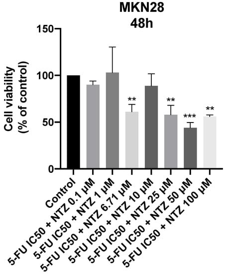 Cell viability of MKN28 cells treated with the combination of 5-FU and nitazoxanide. Values are expressed as percentages of control and represents means ± SEM. Each experiment was done three times independently (n = 3); ** statistically significant vs. control at p < 0.01; *** statistically significant vs. control at p < 0.001.