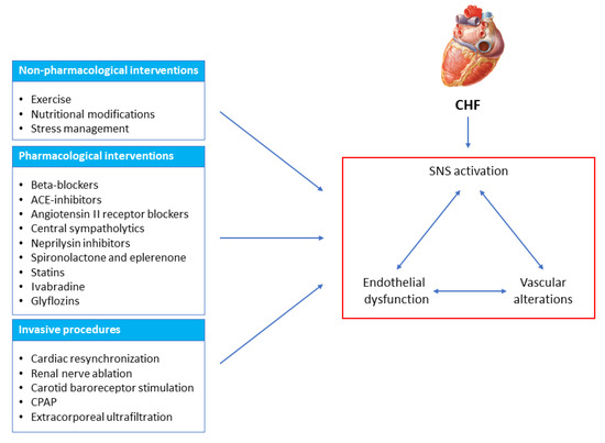 The present paper, after briefly recalling the methodological approaches to assess vascular, endothelial and sympathetic functions in human beings, will examine the effects of different therapeutic interventions targeting the vascular/sympathetic alterations characterizing CHF (Figure 1). This will be performed by reviewing non-pharmacological, pharmacological and invasive instrumental approaches currently employed in clinical settings. The goals of therapeutic interventions having vascular and sympathetic alterations as targets that have not yet been accomplished in current clinical practice will also be specifically mentioned. These unmet objectives will likely represent the goals of research in this area in the years to come.