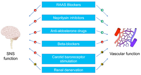 Effects of various therapeutic procedures on sympathetic and vascular dysfunctions in CHF. Symbol “+” means positive effects, and symbol “−” negative effects. RAAS, renin–angiotensin–aldosterone system. Other abbreviations as in Figure 1.