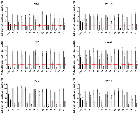After reaching a confluence state, cells were trypsinized and counted by the trypan-blue exclusion assay and then seeded with an initial density of 2 × 104 cells/mL in 96-well culture plates (Nunc, Apogent, Denmark) and left to adhere and grow for 48 h. Subsequently, the medium was removed, and the cells were treated with compound solutions (10 and 50 µM for preliminary studies and 0.01, 0.1, 1, 10, 50, and 100 µM for concentration-response studies) in complete culture medium for 72 h. 5-Fluorouracil (5-FU) was used as a positive control, and untreated cells were used as the negative control. Compounds leading to cell proliferation relative to control clearly below 50%, at 10 µM, or clearly below 25%, at 50 µM, in the screening studies were selected to concentration-response studies in tumoral cell lines. Each experiment was performed in quadruplicate and independently at least two times. The in vitro antiproliferative effects were evaluated by the MTT assay (Sigma-Aldrich, Inc. St. Louis, MO, USA). After the incubation period, the medium was removed, and 100 µL of phosphate buffer saline (PBS, NaCl 137 mM; KCl 2.7 mM; Na2HPO4 10 mM; and KH2PO4 1.8 mM in deionized water with a pH adjusted to 7.4) were used to wash the cells. Then, 100 µL of the MTT solution (5 mg/mL) was prepared in the appropriate serum-free medium and added to each well, followed by incubation for 4 h at 37 °C. Hereafter, the MTT containing medium was removed, and the formazan crystals were dissolved in DMSO. Then, the absorbance was measured at 570 nm using a xMarkTM microplate spectrophotometer from BIO-RAD Laboratories. Cell viability values were expressed as percentages relative to the negative control.