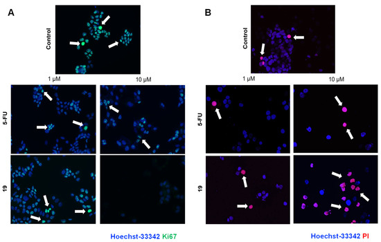 Representative photomicrographs of MCF-7 cell line after (A) Hoechst-33342/Ki67 and (B) Hoechst-33342/PI staining. The most representative stained cells are indicated with an arrow. Cells were treated with 5-FU, as positive control, and 19 at 1 and 10 µM, during 48 h.