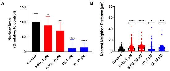 (A) MCF-7 nuclear area of cells untreated (control) and cells treated with 5-FU and 19 at 1 and 10 µM, incubated during 48 h; (B) Nearest neighbor analysis of MCF-7 cells in the same conditions referred previously. Data are representative of at least two experiments. * p < 0.05, ** p < 0.01, *** p < 0.001, **** p < 0.0001 compared to control (unpaired two tailed Student’s t-test).