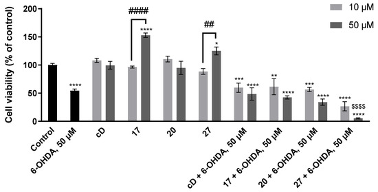The loss of dopaminergic neurons is one of the main hallmarks of Parkinson’s disease, and 6-OHDA can replicate some pathological features of this disease, including dopaminergic neuronal loss [56,57]. N27 cells treated with 50 μM 6-OHDA for 24 h presented an almost 50% reduction in cell viability compared to the control (Figure 6), showing that exposure to this toxin leads to significant dopaminergic cell death. The incubation with 10 µM of cD as well as with compounds 17, 20, and 27 did not affect cell viability. Nevertheless, N27 cells treated with 50 µM of compounds 17 and 27 presented a fold-increase of 1.53 and 1.25, respectively, in cell viability compared to the control and a fold-increase of 1.59 and 1.41, respectively, compared to 10 µM of the respective compounds, after 24 h exposure (Figure 6). The opposite effect was observed after 72-h of incubation with the same compounds (Figure 2), indicating that compounds 17 and 27 affect N27 cell survival in a time-dependent manner.