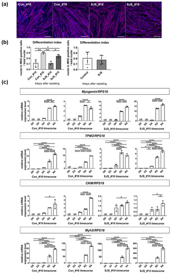 3.1. Differentiation of Myotubes Derived from Control and SJS-hiPSCs