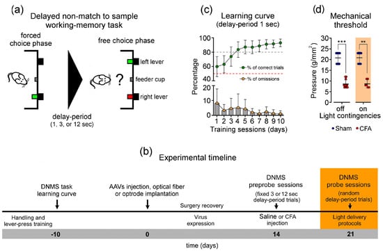 Working memory task, learning curve, and experimental timeline. (a) Diagram of delayed non-match to sample (DNMS) WM task used in this study. Each trial began with a single lever being exposed (forced-choice phase). When the rat pressed the lever, it was retracted and the delay-period was initiated. At the end of this period, both levers were exposed (free-choice phase), and to obtain a reward pellet, the rat needed to press the opposite lever selected in the forced-choice phase. (b) Timeline of the experimental protocol. In brief, after the learning curve each rat was injected with a virus to express eNpHR3.0 opsin in LHb neurons projecting to VTA, and implanted with an optical fiber in the VTA. After postoperative recovery (14 days), rats were subjected to saline injection (Sham group) or an inflammatory pain model (CFA group) and trained in the DNMS task using six-day single delay-period contingencies (3 or 12 s; ahead referred as pre-probe sessions). Optogenetic neuromodulation protocols were applied 7 days after saline or CFA injection (probe sessions). Light delivery was applied during the delay-period of the DNMS task using a fixed intensity of 5–6 mW at the fiber tip. Each probe session was composed of a random sequence of 3 and 12 s delay-period challenge trials, in equal numbers. Light neuromodulation protocols were applied in independent probe sessions. (c) DNMS task learning curve, gain in performance during 10 consecutive training sessions using a delay-period challenge of 1 s (top panel), and corresponding percentage of performed omissions (bottom panel). (d) Effects of contralateral photoinhibition of LHb neurons projecting to VTA in mechanical sensitivity threshold. Comparisons between experimental groups and light delivery protocols were based on non-parametric Kruskal-Wallis (KW) test followed by post hoc Dunn’s test. Values are presented as mean ± S. D. Significant results are indicated by ** when p < 0.01, and *** when p < 0.001.