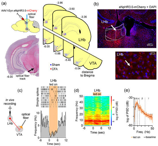 Optical fiber location, virus expression in LHb neuron projecting to VTA, and functional electrophysiological validation of the selective optogenetic neuromodulation protocol. (a) Top left panel illustrates the experimental paradigm for optogenetic viral particles infusion in the LHb and optical fiber implantation in the VTA, and bottom left panel represents an example of a histological brain section consisting the optical fiber tip location in the VTA. Right coronal diagrams illustrating the virus infusion locations in the LHb (top panel) and the optical fiber locations in the VTA (right bottom panels). Top and bottom numbers represent the anterior-posterior distance (in millimeters) relative to bregma cranial point. Sham-treated rats illustrated by blue dots, and CFA-treated rats by red dots. (b) Coronal slice example of the LHb transfected area (top panel), and magnification of the LHb area (bottom panel). Red fluorescent protein (mCherry) labeling indicates eNpHR3.0 LHb transfected neurons. Blue dots represent the DAPI, DNA-labeling as nuclear counterstain. (c) Strategy used for optogenetic inhibition of LHb glutamatergic neuron terminals into the VTA (left panel). Effects of optogenetic photoinhibition in the background activity of a LHb eNpHR3.0-expressing unit. Vertical orange rectangle indicates the period of light photoinhibition. The recorded unit exhibited significant inhibition of their discharge activity during the light delivery period. (d) Full spectrogram of raw LFP activity recorded in the LHb, and (e) the corresponding power spectral density (PSD) traces representing 6 s of ongoing LFP activity recorded during the photoinhibition period, delimited by vertical dotted lines. Power distribution traces were compared using a two-side Kolmogorov-Smirnov test (ks2-test, p < 0.05). LFP signals power traces indicate a light-dependent effect (LHb: ks2 = 0.38, p = 0.0009). Frequency bands: δ, 1–4 Hz; θ, 4–9 Hz; α, 9–15 Hz; β, 15–30 Hz; γ, 30–50 Hz. Physical parameters of photoinhibition: continuous orange pulse at 620 nm, and intensity of 5–6 mW. Values are presented as mean ± S. D.