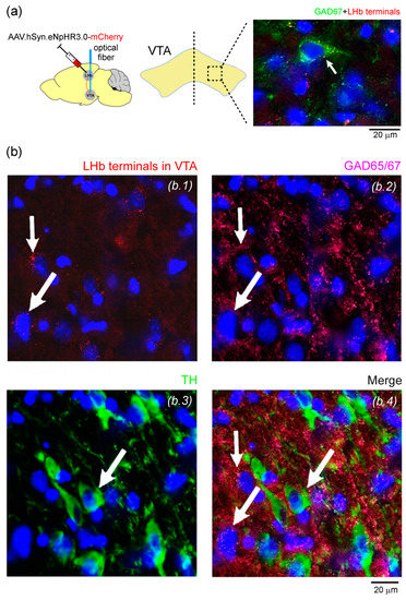 Immunohistochemical analysis confirmed the expression of eNpHR3.0-mCherry at the projection terminals of the glutamatergic neurons from the LHb around the neuronal cell bodies in VTA GABAergic neurons (GAD65/67 positive neurons), and showed that only a residual number of TH-positive neurons co-localized with LHb terminals in VTA (Figure 3).