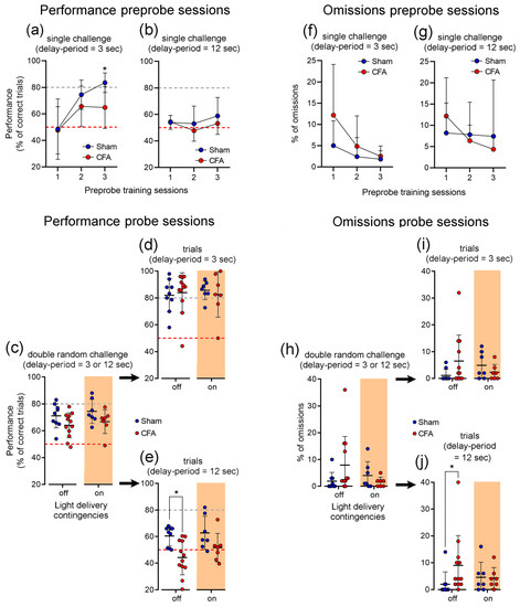 To further analyze the impact of trial omissions on the WM performance of each experimental group, we calculated the percentage of omissions per behavioral contingency (Figure 4f,g). In respect to pre-probe sessions, we found that CFA-treated rats exhibited a higher percentage of omissions when compared to controls using a delay-period challenge of 3 s (KW = 14.41, p = 0.0132; Figure 4f), but this effect was not extended to 12 s sessions (KW = 7.00, p = 0.2210; Figure 4g). In the case of the probe sessions composed of double random challenges (Figure 4h), no significant differences were observed between groups and optogenetic treatments (KW = 4.72, p = 0.1933). Next, from these sessions we took into consideration only the trials that corresponded to each contingency (Figure 4i,j). For 3 s challenge, no significant effect between treatments was observed (KW = 4.26, p = 0.2346; Figure 4i), in contrast to the 12 s challenge (KW = 7.81, p = 0.050; Figure 4j). Moreover, for 12 s without light inhibition the post hoc test revealed that CFA-treated rats performed more omissions when compared to controls (light-off: sham vs. CFA, p < 0.05; post hoc Dunn’s test).