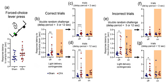 To further examine the relationship between response latency and WM behavioral performance, we calculated the average lever press response latency to forced-choice or free-choice phases in both correct and incorrect trials (Figure 5). In respect to forced-choice phase lever, our data revealed no significant differences between experimental groups (unpaired t-test; p = 0.0715, t = 1.862, df = 33; Figure 5a). In the correct trials of free-choice phase, statistical analyses revealed a significant effect between the experimental groups and light delivery protocols (KW = 19.65, p = 0.0002; Figure 5b); post hoc testing further revealed that CFA-treated rats exhibit a higher response latency when compared to controls in the absence of photoinhibition during the delay-period (post hoc Dunn’s test, p < 0.01). Next, from these sessions we repeated the analysis considering only the trials that correspond to each delay-period contingency. For both delay-period challenges, statistical analysis revealed a significant effect between groups and treatments (3 s: KW = 18.32, p = 0.0004; and 12 s: KW = 15.12, p = 0.0017; Figure 5c,d, respectively); post hoc testing revealed also that CFA-treated rats exhibit a higher response latency when compared to controls (light-off: 3 s, p < 0.001; and 12 s, p < 0.01). Interestingly, after photoinhibition, these response latencies in CFA animals were again similar to controls. In the case of incorrect trials, statistical analysis revealed a significant effect between groups and light delivery protocols (KW = 10.46, p = 0.0151; Figure 5e); moreover, post hoc testing revealed that CFA-treated rats exhibit a higher response latency when compared to controls (light-off: sham vs. CFA, p < 0.05). It is important to note that when only the response latency pattern associated to 3 s delay-period of the incorrect trials was analyzed, no significant differences were observed (KW = 4.67, p = 0.1976; Figure 5f). In contrast, during 12 s delay-period of the incorrect trials, we found a significant effect between experimental groups and light delivery protocols (KW = 8.50, p = 0.0368; Figure 5g). In fact, post hoc test also revealed a higher response latency in CFA-treated rats (light-off: sham vs. CFA, p < 0.05). Further, experimental groups subjected to photoinhibition again exhibited a similar latency, indicating the effect of LHb inhibition in their partial recovery in the performance.