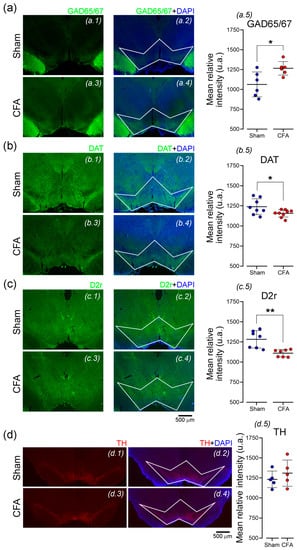 To determine if inflammatory pain caused alterations in synaptic transmission, we quantified the expression of GABA or DA cell markers in the VTA of sham or CFA rats. We calculated the mean relative fluorescence intensity in the VTA delimited area. Our data showed that CFA-treated rats reveal an upregulation in GAD65/67 marker when compared with controls, suggesting an overactivation in VTA inhibitory GABAergic neurons (MW, U = 4, p = 0.0260; Figure 6a). In contrast, a downregulation in DAT (unpaired t-test, p = 0.0403 (t = 2.245, df = 15); Figure 6b) and D2r (MW, U = 1, p = 0.0012; Figure 6c) was observed. Interestingly, no significant differences were observed in TH expression (unpaired t-test, p = 0.4025 (t = 0.89, df = 6.75); Figure 6d).