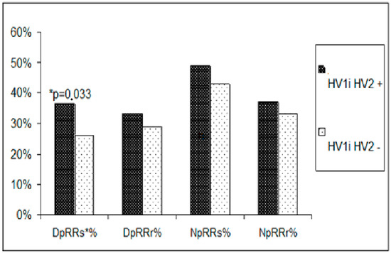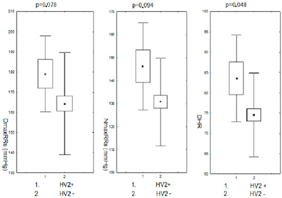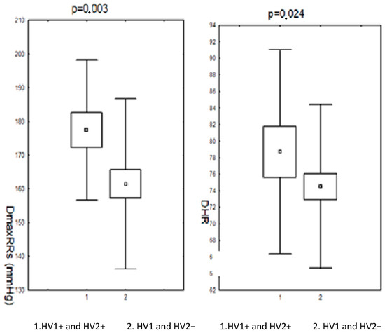 Maximum systolic blood pressure values during the day in patients (pre- and postmenopausal) with arterial hypertension with the changes in the HV1 regions. DDmaxRRs-daily maximum systolic blood pressure, HV1+,-positive for HV1 changes, HV1−,-negative for HV1 changes.