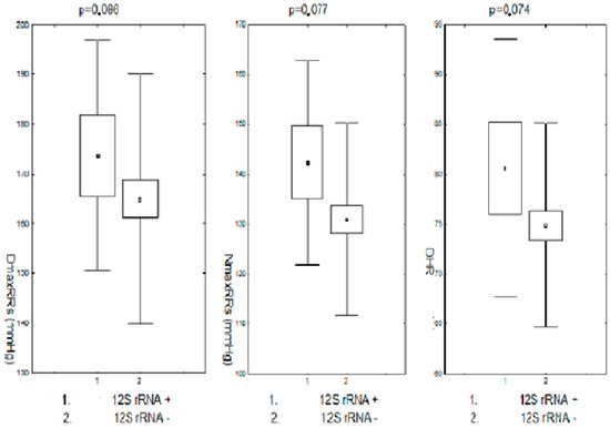 Changes in the nucleotide sequence in the 12S RNA coding region were associated with the modification of the parameters of the monitored RR in their presence, but only in a way close to statistical significance. Maximum daytime and nighttime systolic RR and daytime heart rate were slightly higher in the group of subjects with nucleotide sequence changes in the coding region of the 12S RNA compared to the corresponding values in the group without these changes. The differences in each case were close to statistical significance. The other parameters of the monitored pressure showed no differences between these groups. These data are presented in Figure 5.
