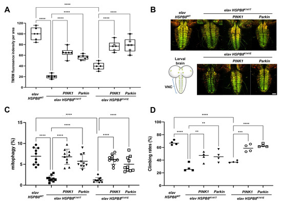 Kang, K.-h.; Han, J.E.; Kim, H.; Kim, S.; Hong, Y.B.; Yun, J.; Nam, S.H.; Choi, B.-O.; Koh, H. PINK1 and Parkin Ameliorate the Loss of Motor Activity and Mitochondrial Dysfunction Induced by Peripheral Neuropathy-Associated HSPB8 Mutants in Drosophila Models. Biomedicines 2023, 11, 832. https://doi.org/10.3390/biomedicines11030832