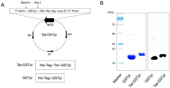 Construction and purification of Tat-GSTpi protein. (A) Schematic sequence of Tat-GSTpi and GSTpi protein. Tat-GSTpi protein consists of six histidine, Tat peptide, and cDNA of human GSTpi; (B) Purification of Tat-GSTpi and GSTpi proteins were analyzed by SDS-PAGE and Western blotting with an anti-histidine antibody.