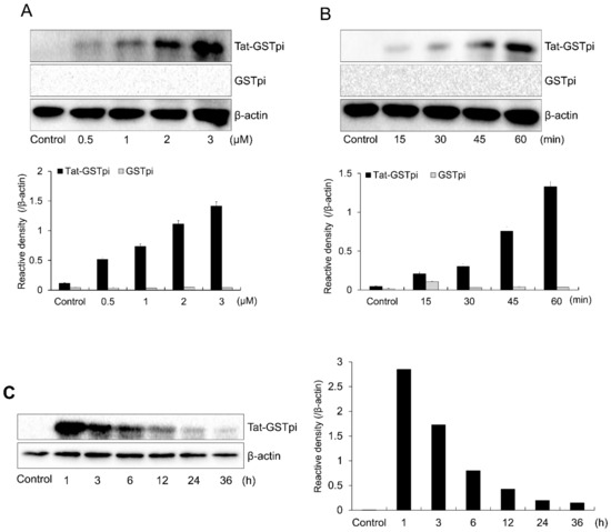 In order to deliver SH-SY5Y cells to the fusion proteins, we treated Tat-GSTpi proteins with various concentrations and incubation times (Figure 2A,B). Increasing the concentration and incubation time increased the amount of Tat-GSTpi protein detected using anti-His antibody. Furthermore, we showed that the delivered Tat-GSTpi protein was detectable for up to 24 h (Figure 2C). However, GSTpi protein was not delivered to the cells. These results indicate that the Tat-GSTpi proteins were delivered to the SH-SY5Y cells and were present in them for 24 h.