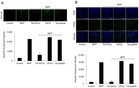 To assess the effect of Tat-GSTpi proteins on MPP+-induced ROS production and DNA damage in SH-SY5Y cells, DCF-DA and TUNEL staining was conducted (Figure 4A,B). The results showed that MPP+ markedly increased the amounts of ROS production and DNA damage and that the differences were not significant between the GSTpi protein and the Tat peptide-treated cells compared with MPP+-only exposed cells. However, the Tat-GSTpi protein reduced ROS production and DNA damage, indicating that the delivered Tat-GSTpi protein significantly inhibited cell death and reduced the levels of ROS and DNA damage.
