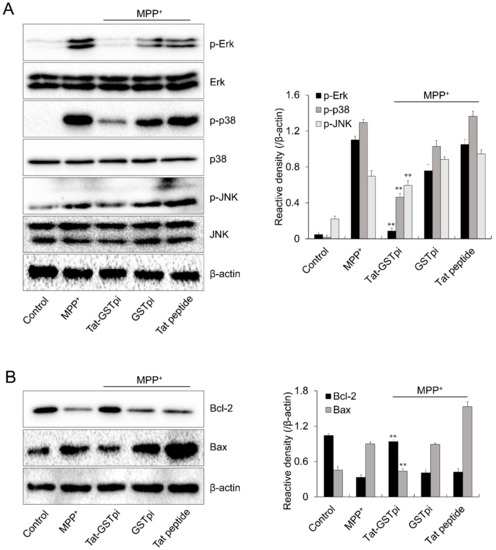 We further investigated the effect of the Tat-GSTpi protein on Bax and Bcl-2 expression because MPP+-induced intracellular ROS can stimulate apoptotic signaling [39,40]. The expression level of Bcl-2 was reduced in MPP+-only exposed SH-SY5Y cells. However, the Tat-GSTpi protein increased the expression of Bcl-2. In contrast, the expression level of Bax was increased by MPP+ while the Tat-GSTpi protein reduced the expression level of Bax in MPP+-exposed cells (Figure 5B). Neither the GSTpi protein nor the Tat peptide affected the expression of Bcl-2 and Bax. Although further research on signaling pathways is needed, Tat-GSTpi proteins have a function in regulating MAPKs and apoptotic signaling through MPP+.