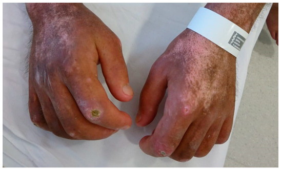 A 44-year-old Caucasian male diagnosed with early diffuse cutaneous systemic sclerosis (dSSc) (anti-Scl-70 antibodies positive (+++)) with a duration of 3 months was admitted to the Department of Rheumatology, Medical University of Bialystok, Poland, due to progressive skin thickening, painful ulcers on both hands (Figure 1), and signs of heart involvement (high troponin and N-terminal pro b-type natriuretic peptide (NT-proBNP) concentrations). No significant changes in the coronary arteries were found on coronarography. The results of the laboratory tests are presented in Table 1. The patient’s medical history included hypertension, dyslipidemia, and alcohol dependence syndrome. During hospitalization, heart involvement due to dSSc was confirmed by MRI, while nailfold capillaroscopy revealed severe microangiopathy typical of dSSc (Figure 2).