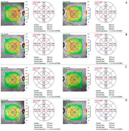 (A). Initial OCT thickness mapping of RE and LE. (B). OCT thickness mapping of RE and LE 4 weeks later, showing reduction. (C). OCT thickness mapping of RE and LE 6 months later showing further reduction. (D). OCT thickness mapping of RE and LE around 12 month follow-up, showing stabilization.