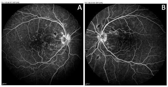 Fluorescein angiography of (A) RE and (B) LE reflecting vascular wall enhancement, vein dilatation, and capillary occlusion, as well as slight leakage within macula and optic disc in RE.