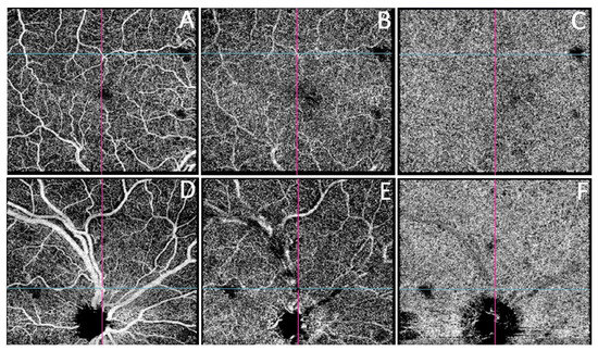 OCT-A of RE reflecting local deficiency within superficial and deep capillary plexus and choriocapillaris. (A–C) Macular area and (D–F) peripapillary area: (A,D) superficial plexus, (B,E) deep plexus, (C,F) choriocapillaris.