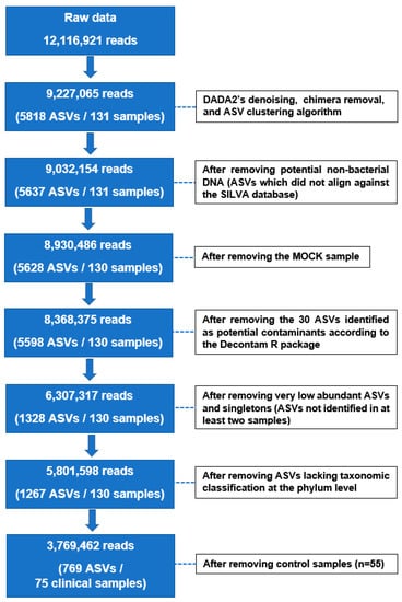 - Davis, N.M.; Proctor, D.M.; Holmes, S.P.; Relman, D.A.; Callahan, B.J. Simple statistical identification and removal of contaminant sequences in marker-gene and metagenomics data. Microbiome 2018, 6, 226. [Google Scholar] [CrossRef]