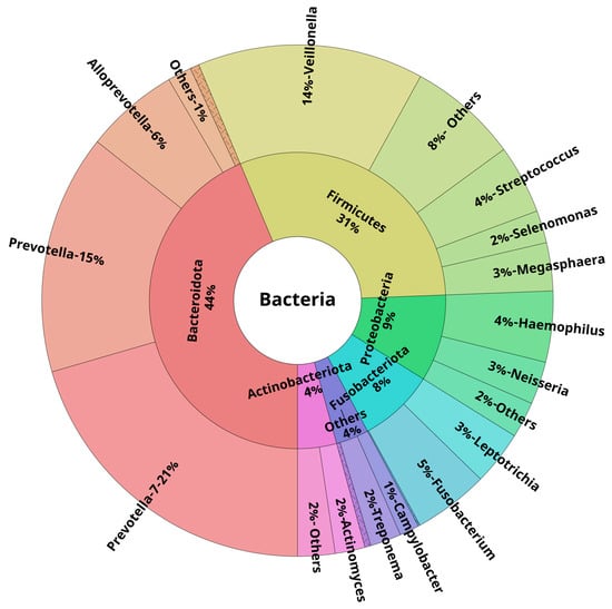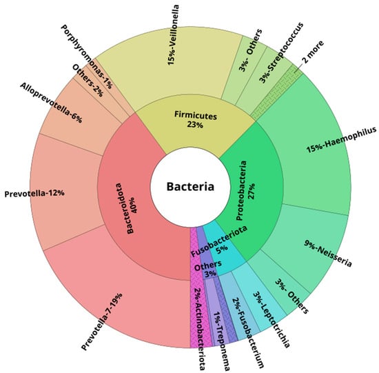 Krona plot showing the mean taxa relative abundances at the phylum and genus levels in oral washes of healthy young subjects (n = 25). Only the phylum (inner layer) and genus (outer layer) levels are displayed for better visualization. Only the top 15 genera are shown (based on their mean relative abundance across all clinical samples, n = 75). Less abundant phyla and genera were included in the “Others” group.