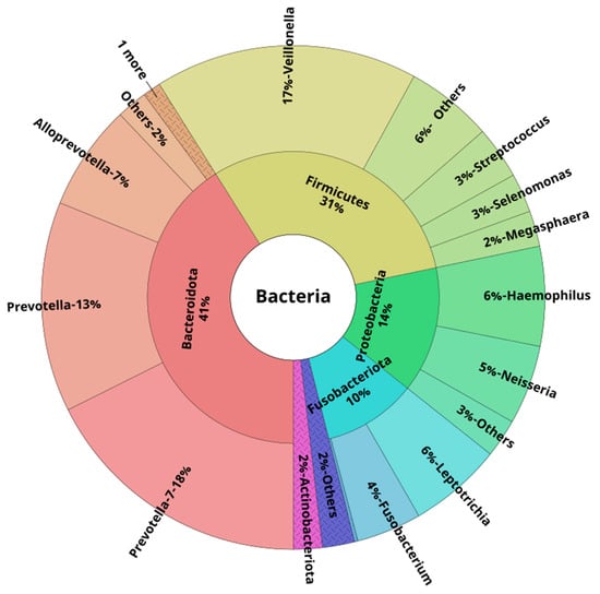 At the phylum level, in healthy young subjects, the majority of the reads in both oral and lower airway compartments belonged to Bacteroidota, Firmicutes, Proteobacteria, Fusobacteriota, and Actinobacteriota. These five phyla accounted for ~97%, ~96%, and ~98% of all reads across OW, BB, and BAL samples, respectively. At the genus level, the most abundant ones were Prevotella-7, followed by Veillonella and Prevotella. These three genera were responsible for ~50% of all the reads: 46% (OW), 50% (BB), and 48% (BAL). Figure 2, Figure 3 and Figure 4 show the mean relative abundances of the most common phyla and genera for each microbiome compartment using Krona plots [] (pie charts in which different taxonomic levels are shown in sectors according to an embedded hierarchy). Overall, at the species level, the most abundant ASVs were identified as Veillonella dispar, Haemophilus parainfluenzae, followed by several Prevotella species (P. jejuni, P. melaninogenica, P. pallens, P. salivae, P. intermedia, and P. nigrescens) (Table S3).