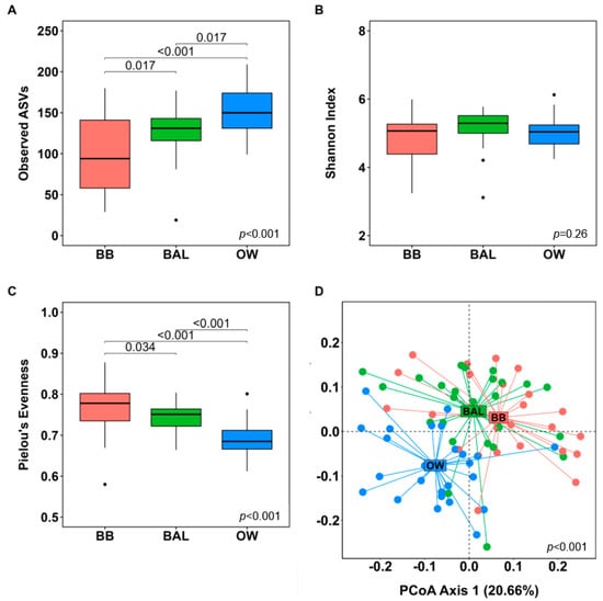 We detected several differences in the microbial diversity between BB, BAL, and OW samples. Overall, alpha-diversity analyses (Figure 5A–C) showed that the OW samples had the highest microbial richness, whereas the BB samples had the lowest (p < 0.001). Similar results, though in an opposing direction, were observed for evenness as the highest and lowest values were observed in the BB and OW samples, respectively (p < 0.001). For both microbial richness and evenness, BB and BAL samples differed significantly from each other (adj. p = 0.017 and adj. p = 0.034, respectively). No differences in the Shannon index were found across the sample types (p = 0.26).