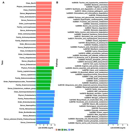 Taxa analyses according to LEfSe provided similar results (Figure 6A). This bioinformatics tool identified, from phylum to genus level, 36 differential taxa differential features across BB, BAL, and OW samples. Out of these, 19 taxa features predominated in BB, and most of them were Gram-positive bacteria. These included the Actinobacteriota phylum (including Actinobacteria class and Micrococcales order), the Bacilli class (along with Staphylococcaceae family and Staphylococcus genus), and the Actinomycetales order and its related Actinomycetaceae family and Actinomyces genus. On the other hand, seven taxa features were enriched in BAL, which included a mixture of Gram-positive (Firmicutes phylum) and Gram-negative (Leptotrichiaceae family and its corresponding Leptotrichia genus). Ten taxa features showed higher expression in OW, and all of these were Gram-negatives, including but not limited to the Proteobacteria phylum, Gammaproteobacteria class, and Haemophilus and Neisseria genera.