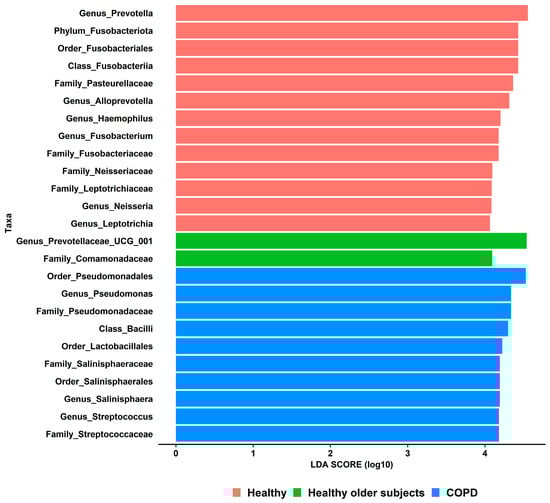 Differential taxa features identified in bronchial brushings of healthy young (n = 25), healthy older (n = 23), and COPD (n = 24) subjects. LEfSe analyses were performed using a linear discriminant analysis (LDA) effect size > 4.0. Both COPD (chronic obstructive pulmonary disease) and healthy older subjects were enrolled into the British Columbia Cancer Agency (BCCA) cohort.