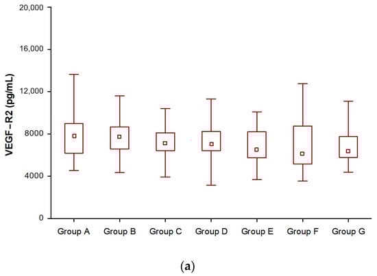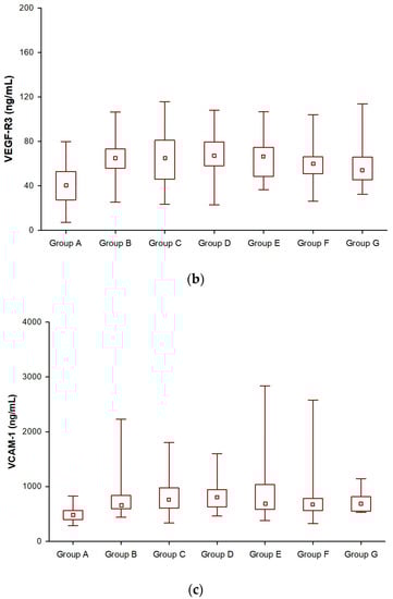In the NET patient group, we had statistically significant evidence that the median differences in VEGF-R2 and VCAM-1 levels were significant. There were significant differences in VEGF-R2 (Figure 1a) and VCAM-1 levels in all groups after SSA treatment compared to before SSA therapy (Table 3, Figure 1a,c). Given the concentration of VEGF-R3, in the group of patients treated for 12 and 24 months, VEGF-R3 concentrations were similar to those before treatment and slightly increased. It was only after 2 years of SSA therapy that they began to decrease and were significantly lower than those before treatment (Groups E, F, and G) (Table 3, Figure 1b).