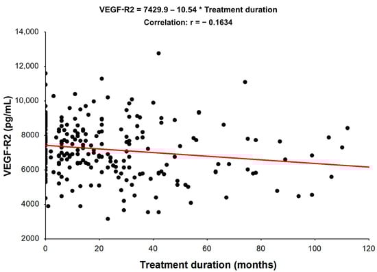 Moreover, regarding Spearman’s correlation assessment of the relationship between VEGF-R2, VEGF-R3, VCAM-1, and the duration of treatment (Table S2 in the supplementary material), a negative, statistically significant correlation was shown between VEGF-R2 and the duration of treatment. With the increase in the treatment period, a decrease in VEGF-R2 levels was observed (Figure 2). Regarding Spearman’s correlation assessment of the relation of VEGF-R3 and VCAM-1 to the duration of treatment, it was also not statistically significant (Figures S1 and S2 in the Supplementary Material).