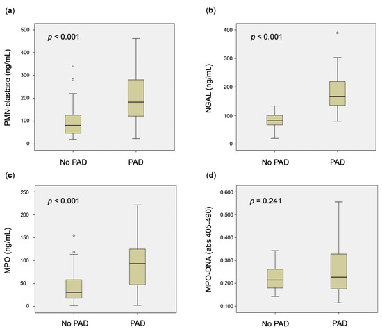 Uni- and multivariable regression analyses, the latter including age, diabetes, hypertension, and active smoking as covariates, confirmed a significant association with the presence of PAD for PMN-elastase (adjusted OR: 1.008; 95%CI: 1.002–1.015; p = 0.006), NGAL (adjusted OR: 1.045; 95%CI: 1.024–1.066; p < 0.001), and MPO (adjusted OR: 1.013; 95%CI: 1.001–1.024; p = 0.028).