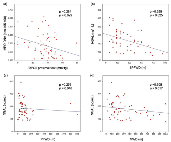 Scatter plot. Linear correlation analyses showing significant correlation between markers of neutrophil activation and vascular tests in patients with symptomatic chronic PAD: MPO–DNA and TcPO2 on proximal foot (a); NGAL and 6PFWD (b), PFWD (c), and MWD (d). Extreme outliers (95th percentile) may not be displayed in the figures. MWD: maximal walking distance; NGAL: neutrophil gelatinase-associated lipocalin; PFWD: pain-free walking distance; 6MWD: 6-min maximal walking distance; 6PFWD: 6-min pain-free walking distance.