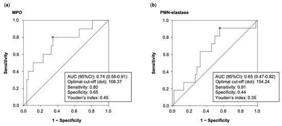 In terms of MACE and/or MALE, ROC curve analyses showed fair and poor prognostic performance for MPO and PMN-elastase, respectively. In particular, MPO displayed an AUC of 0.74 (95%CI: 0.56–0.91), as well as a sensitivity and specificity of 0.80 and 0.65, respectively, for a cut-off of 108.37 ng/mL, determined using Youden’s index. Lower values of AUC were found for PMN-elastase, as shown in Figure 3.