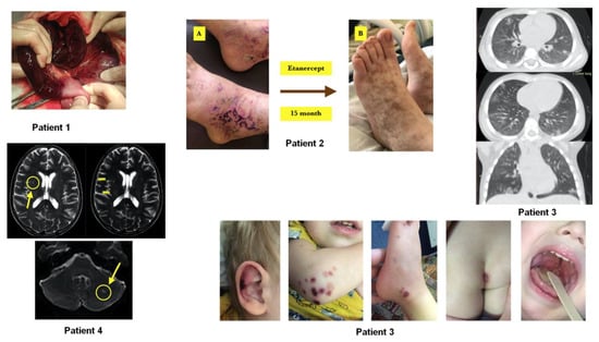 In the studied patients, the following systems were involved: skin (4/4), respiratory (3/4), cardiovascular (2/4), GI (2/4), nervous (1/4), eye (1/4), kidney (1/4), and inner ear (1/4). In all previously healthy patients, known rheumatic diseases (e.g., systemic lupus erythematosus, systemic juvenile arthritis, autoinflammatory diseases, and antiphospholipid syndrome) were ruled out, as well as known monogenic autoinflammatory disease. All patients had increased inflammatory markers (ESR and CRP) and thrombotic parameters (D-dimer). No patient met the MIS-C criteria. Two patients met the criteria of polyarteritis nodosa, one met the IgA vasculitis/Henoch–Schonlein purpura criteria, and one met the unclassified vasculitis criteria. Clinical pictures are presented in the Figure 1.