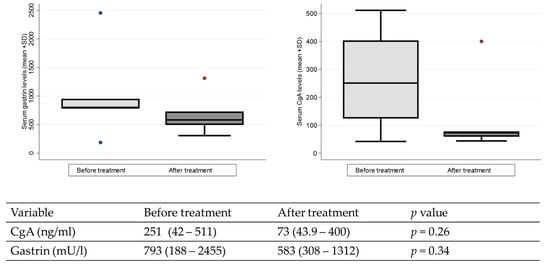 When studying the effects of chronic treatment with somatostatin analogues, a tendency to decrease in gastrin, from 793 (188–2455) mU/L to 583 (308–1312) mU/L, and Cg A levels from 251 (42–511) ng/mL to 73 (43.9–400) ng/mL, were observed, but the differences were not statistically significant (p = 0.34) and (p = 0.26), respectively) (Figure 2).