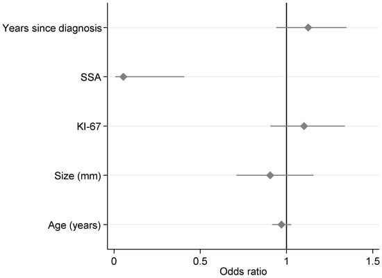 Figure 3. Treatment with somatostatin analogues is shown to be the only independent factor in preventing recurrence of GC-1. (Odds Ratio 0.054; p = 0.005). SSA: Somatostatin analogues.