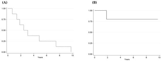 Figure 4. Disease-free survival in 9 patients treated with somatostatin analogues, according to the period of the therapy: without treatment (A), and with somatostatin analogues (B).