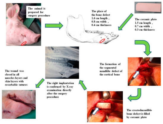- Sun, Z.; Kennedy, K.S.; Tee, B.C.; Damron, J.B.; Allen, M.J. Establishing a critical-size mandibular defect model in growing pigs: Characterization of spontaneous healing. J. Oral Maxillofac. Surg. 2014, 72, 1852–1868. [Google Scholar] [CrossRef] [PubMed]