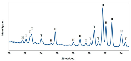 XRD patterns of HAP biphasic ceramics (H—hydroxyapatite, T—α TCP).