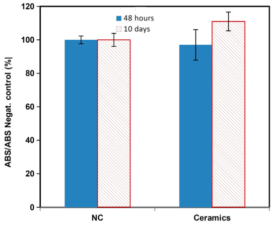 The comparison of relative viabilities (Figure 5) of osteoblasts seeded on ceramic samples clearly demonstrates their non-cytotoxic character because the values of the relative viabilities of cells exceed 100% of negative control.