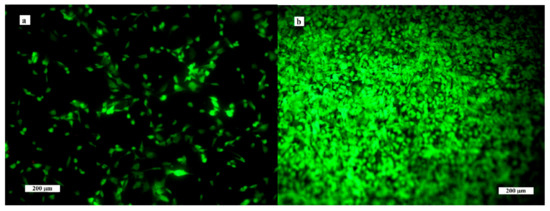 Distribution and morphology of osteoblasts cultured on ceramic samples for 2 (a) and 9 (b) days (live/dead staining).
